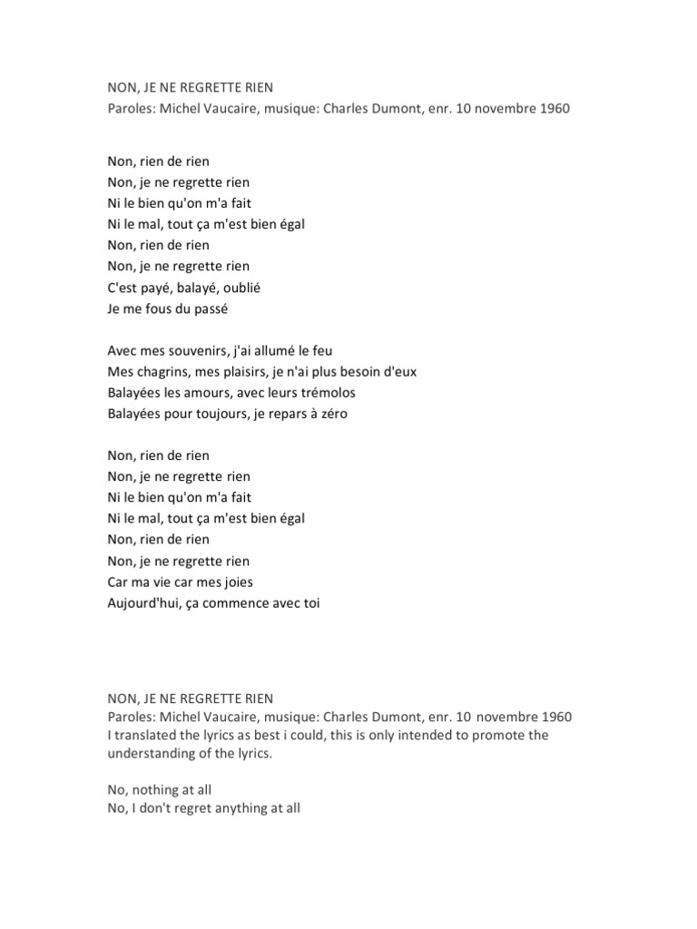 Non Je Ne Regrette Rien In English Zudifer