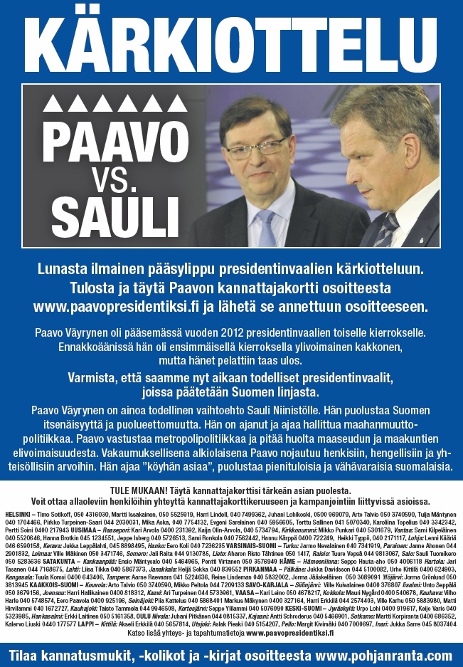 Paavo matti väyrynen 2 september 1946 in kemi ist ein finnischer politiker der zentrumspartei. 1988 1994 und 2012 war er kandidat des zentrums um das amt des staatspräsidenten bei der präsidentschaftswahl 2018 trat er als unabhängiger kandidat an. Odottavan aika on pitkä. Paavo matti väyrynen s 2.